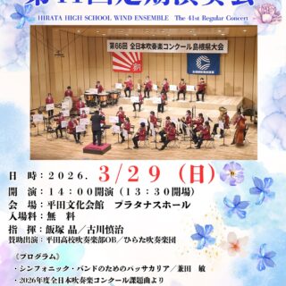 島根県立平田高等学校吹奏楽部 第41回定期演奏会 日 時:2026年3月29日(日)14:00開演(13:30開場) 会 場:平田文化館プラタナスホール 入場料:無 料 曲 目:2026年度全日本吹奏楽コンクール課題曲より シンフォニック・...